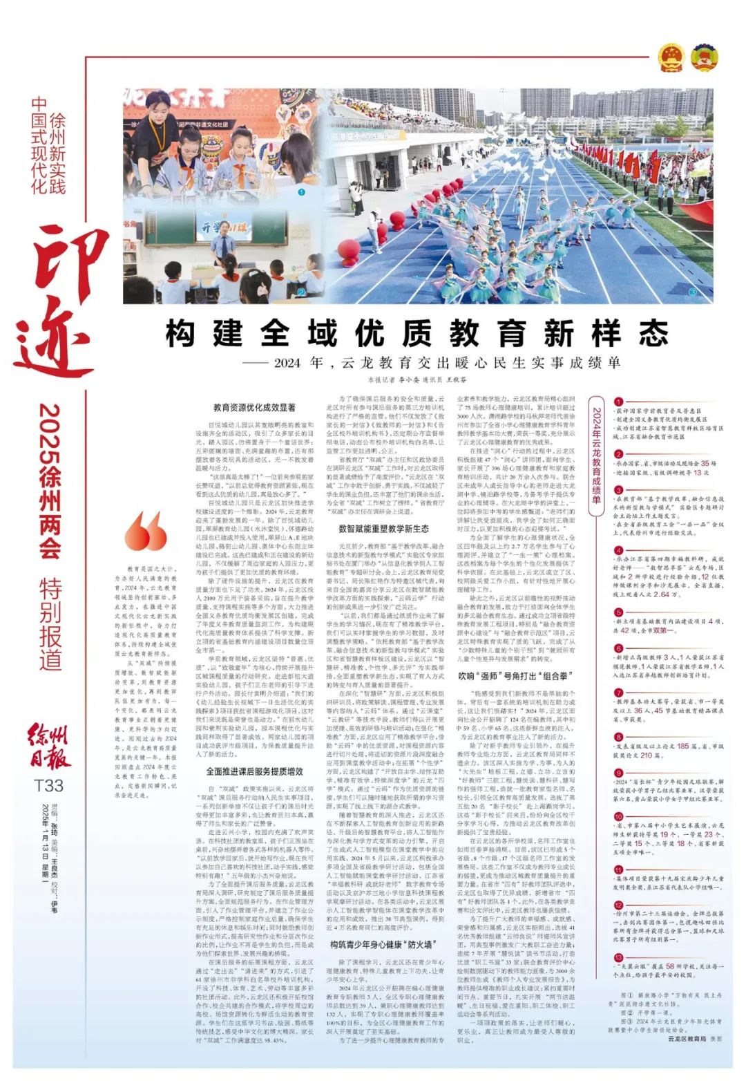 从“双减”持续提质增效、数智赋能驱动变革,到教育资源更加优化,再到教师队伍更加有为,每一个变化,都表明云龙教育事业正朝着更健康、更科学的方向迈进。刚刚过去的2024年,是云龙教育高质量发展的关键一年。本报回顾盘点2024年度云龙教育工作特色、亮点,定格新闻瞬间,记录奋进足迹。