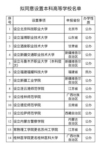 1月13日,教育部发布关于拟同意设置本科高等学校的公示。经教育部党组会议审议,拟同意设置北京科技职业大学、福耀科技大学(暂名,以下简称福耀科大)等14所学校。