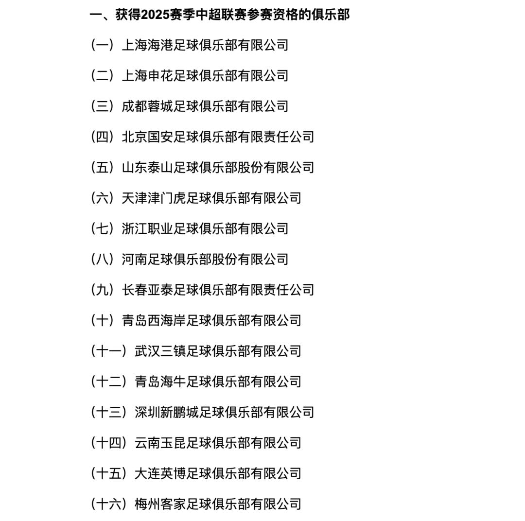 1月15日,中国足球协会公布了2025赛季各有16支队的中超、中甲联赛参赛名单。名单显示,梅州客家递补进入中超联赛;深圳青年人、陕西联合递补进入中甲联赛。