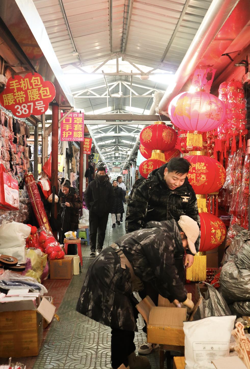 除了新衣,宣武市场还有各种年货摊位。春联、灯笼、福字……每一件商品都充满了节日的喜庆。