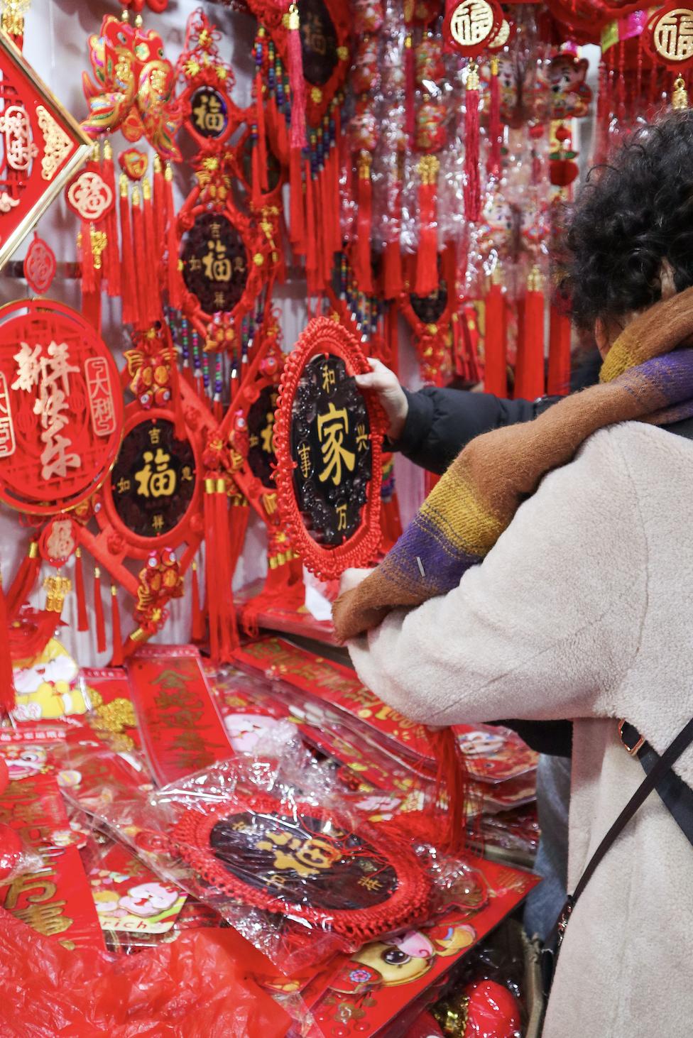 老人们会在这里挑选最红火的春节挂件带回家,寓意来年红红火火。
