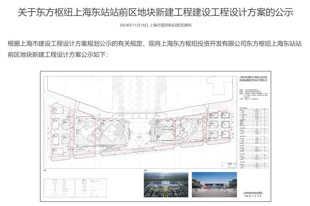 《东方枢纽上海东站站前区新建工程》(五地块)正式进行了规划方案公示。
