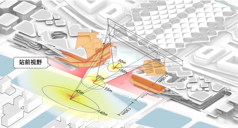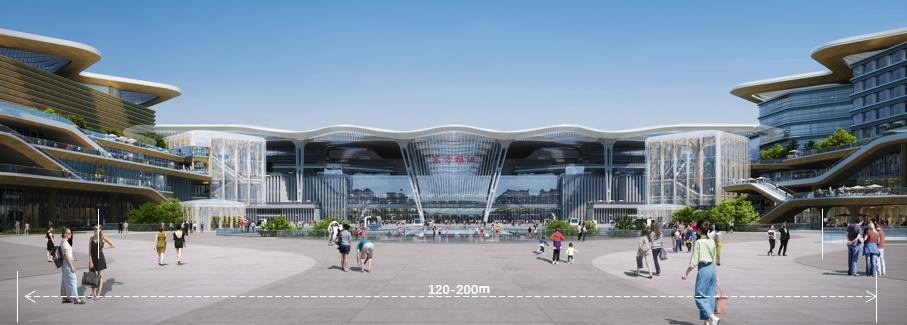 车站西立面轴线突出车站立面的象征性。南北相向设置的退台辅以积极的活动空间和绿化,突出城市的活力和环境未来城市的印象。通过控制在120米到200米之间的站前综合体的楼间距离,赋予车站和枢纽广场适当的规模感,为人们到达和离开留下深刻的空间体验。