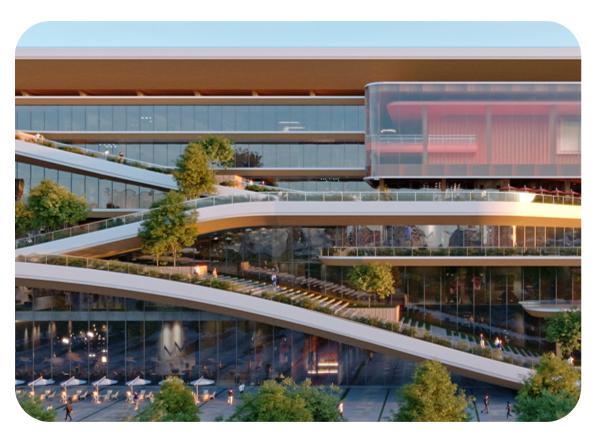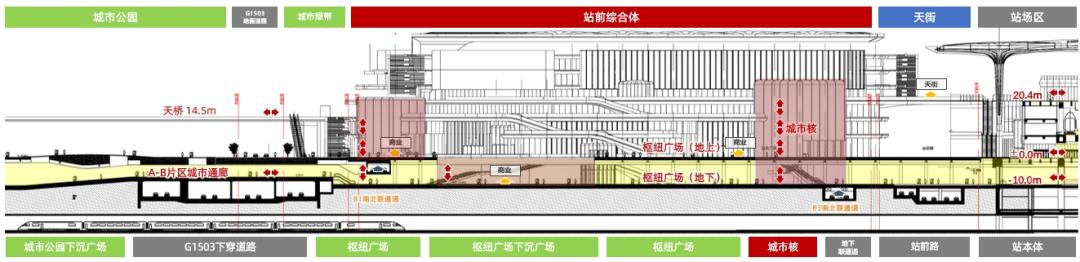 天街层(+20.4m):打造互联互通、立体高效的空中慢行网络。东侧与站场区高架候车层平接,并在南北两侧分别跨集疏运系统上方与上盖区紧密联系。通过独一无二的24小时开放的空中步行景观系统,强化了站城一体的设计主旨。天街层同时可作为消防车应急救援使用以及通往上盖酒店的VIP路径。