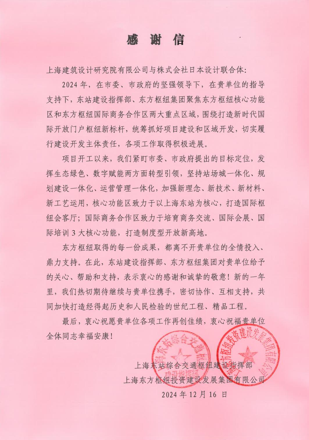 上海院在整个设计过程中始终保持初心,确保设计方案能始终贯彻最初设定的设计理念和效果。近日,上海院设计团队收到了来自东站建设指挥部、东方枢纽集团发来的感谢信,肯定并感谢上海院、日本设计联合体团队在项目建设过程中的全情投入与鼎力支持。