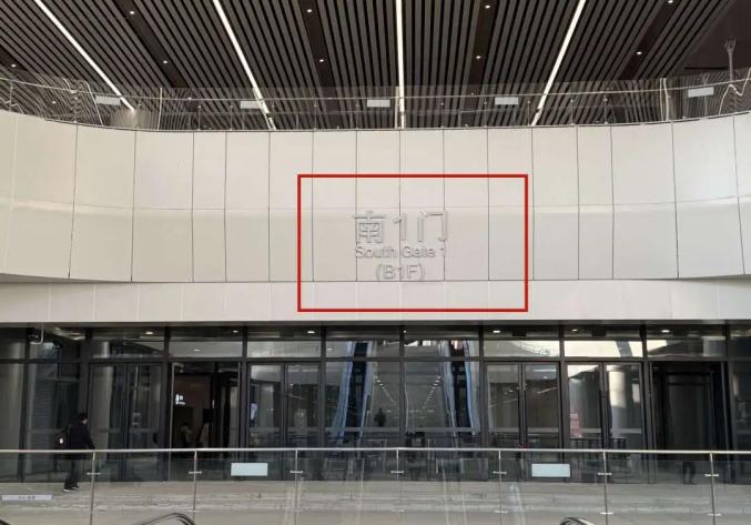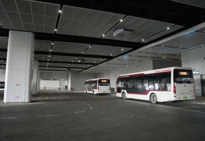 旅客从南区出站后,沿着通道步行,穿过门往左转,往前走,即可看到位于右前方的公交枢纽。