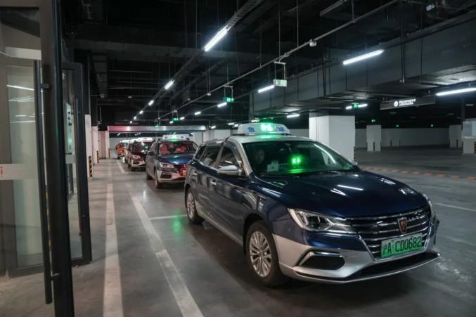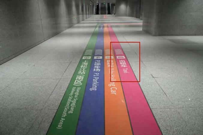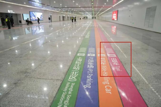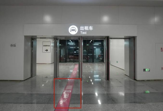 旅客沿扶梯前往B1层,步入南1门,沿着地上醒目的标识步行至出租汽车上客点。