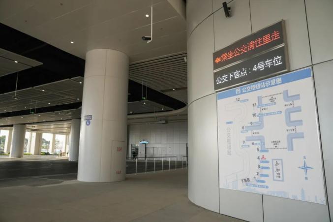 换乘公交的旅客从北区出站后,向右转,往前走,即可看到位于扶梯左侧的公交枢纽。