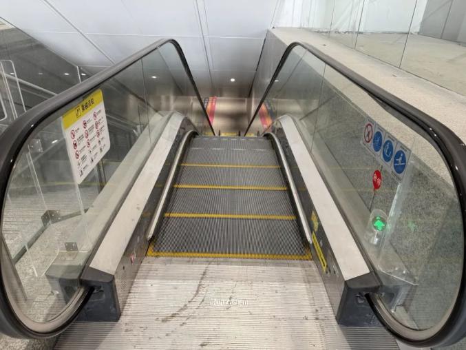 旅客从南区出站后,沿着通道步行,穿过门往左转,向前步行至扶梯口。