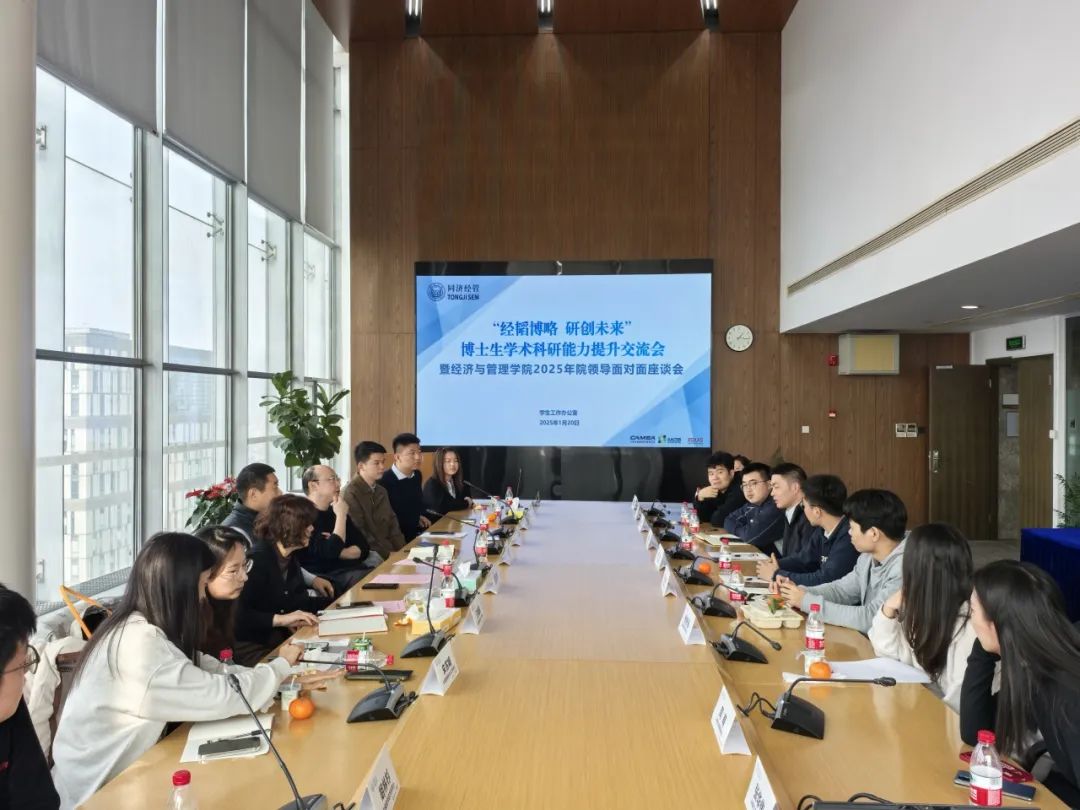 1月20日,“经韬博略,研创未来” 博士生学术科研能力提升交流会暨经济与管理学院2025年院领导面对面座谈会在同济大厦A楼2208召开,我院党委书记施骞,院长谢恩等领导以及学生工作办公室老师出席,与来自不同专业、年级的博士生代表面对面交流座谈。本次活动由学院党委副书记董变林主持。