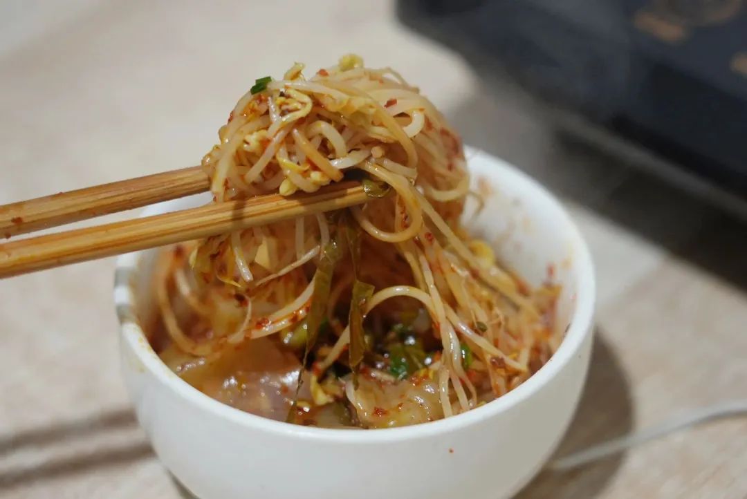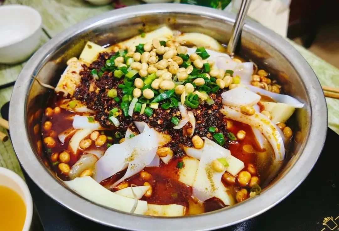 相较于夏天冰爽怡人的凉糕,煮凉糕特色在于丰富多样的配料和独特的调味,在保留凉糕Q弹爽滑口感的同时,加入豆芽、酸菜等提味增鲜辅料,一勺香辣诱人的红油辣椒作为整碗煮凉糕的灵魂注入其中,暖心又暖身,让人回味无穷。
