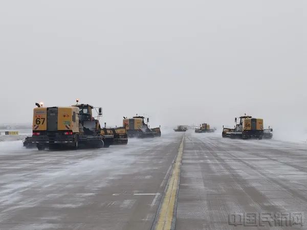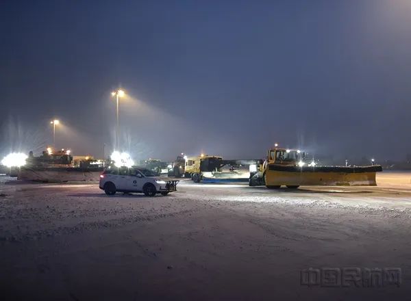 03:27,飞行区开始除冰雪作业,截至12时,共出动除冰雪车辆18辆,累计280人次使用除冰液45吨,融雪剂4吨,开展跑道评估6次,发布雪情通告4份。东西两条跑道均保持适航,所有滑行道、机坪均处于可用状态。