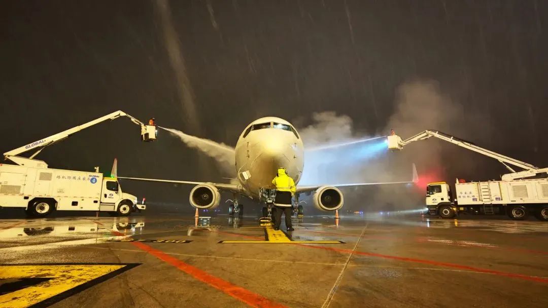 面对恶劣天气,东航甘肃分公司于1月25日凌晨4点,安排机务工作人员早早抵达机坪,用除冰车和专业工具,娴熟地对飞机机翼、机身、尾翼等关键部位进行除冰作业,确保飞机表面无冰霜残留,保障飞行安全。