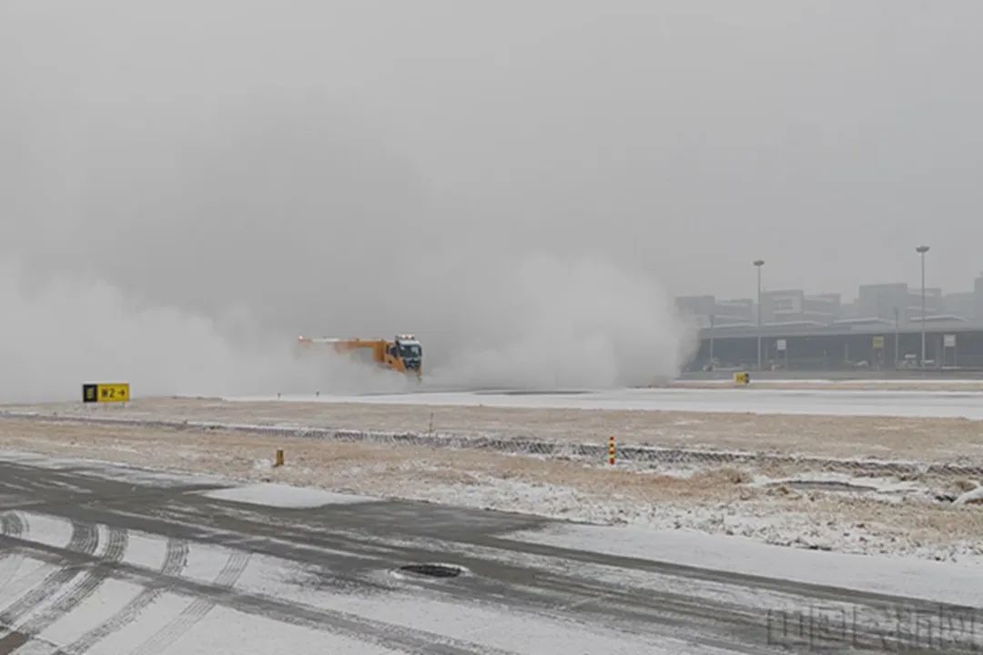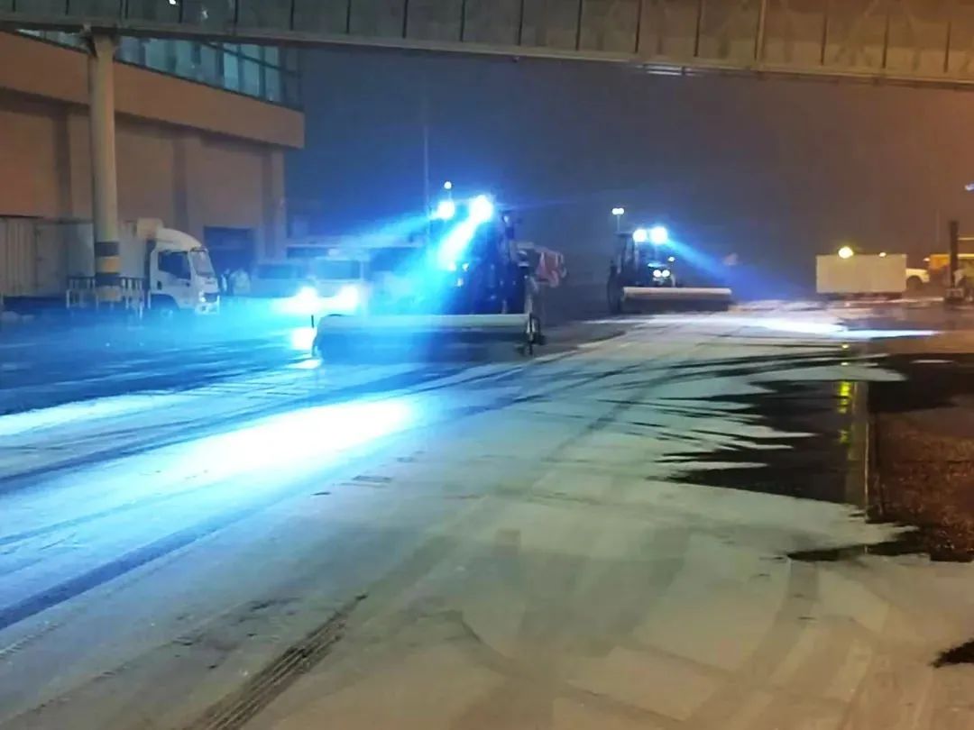 飞行区内,机场工作人员与冰雪抢时间、拼速度,及时收集研判雪情信息,实时关注跑道道面状况,快速启动除冰雪工作,出动吹雪车、撒布车,喷洒除冰液,确保济南机场处于适航状态。