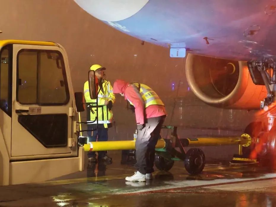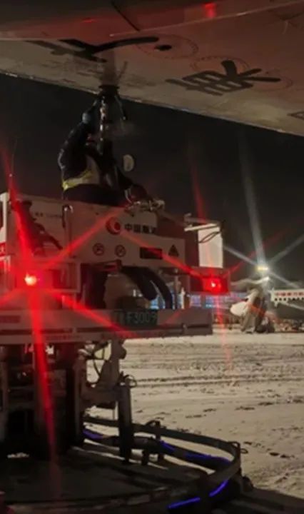 04:07,航空器除冰雪作业开始,截至12时,出动9部除冰车,作业人员120人,完成航空器除冰雪作业29架次。最早两班出港航班G52793、KN2907分别于07:13和07:15顺利起飞。