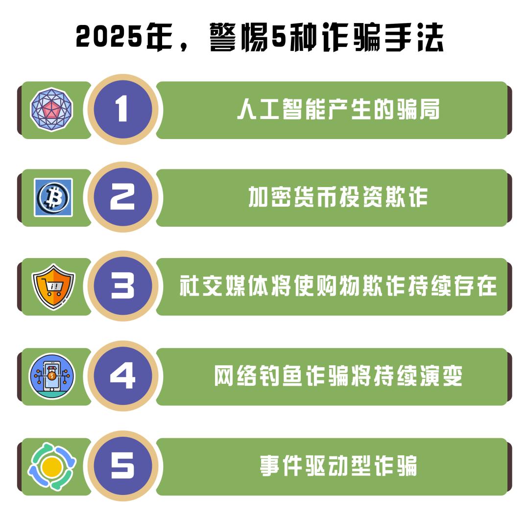 数据服务提供商scamadviser发布的一篇报告显示,2025年,大家需要警惕人工智能产生的诈骗、加密货币投资诈骗、社交媒体下的购物欺诈、网络钓鱼诈骗、事件驱动诈骗等五种诈骗手法。