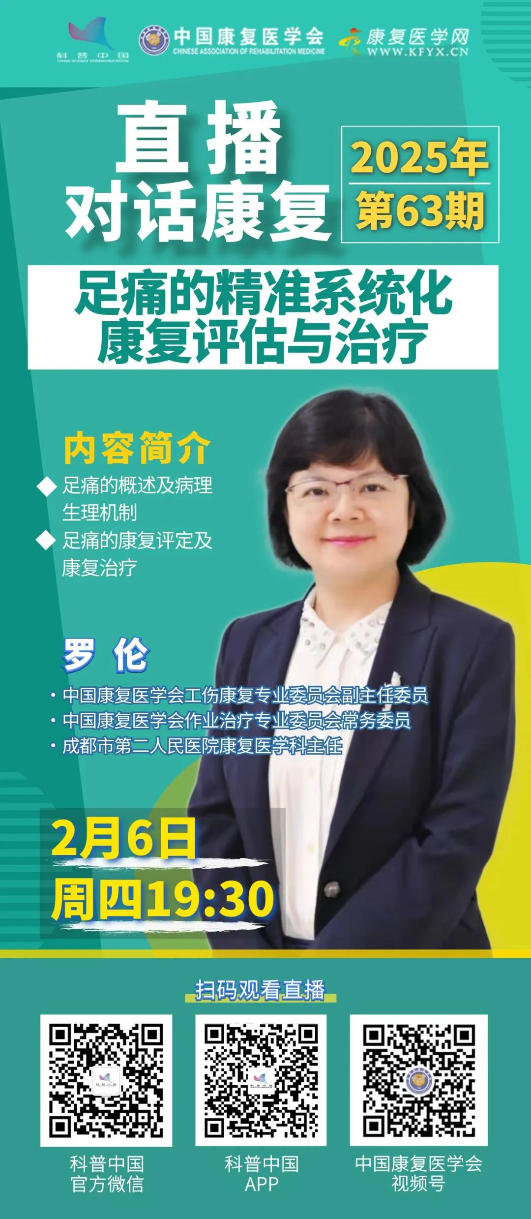 2月6日,我们邀请到了中国康复医学会工伤康复专业委员会副主任委员、作业治疗专业委员会常务委员,成都市第二人民医院康复医学科主任罗伦教授,分享足痛的概述及病理生理机制,畅谈足痛的康复评定及康复治疗!
