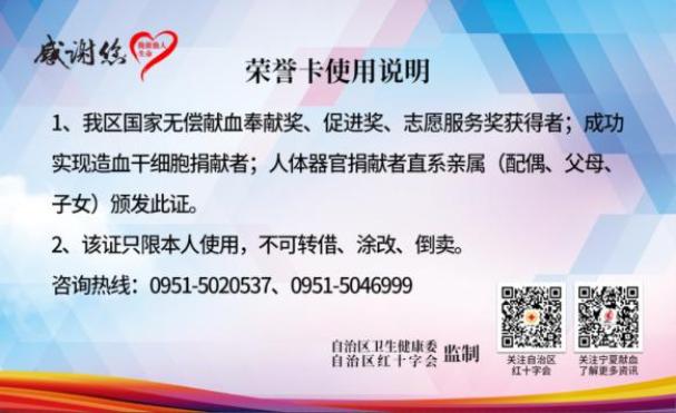 据宁夏血液中心相关负责人介绍,为构建起更为完善的献血服务体系,大幅提升献血后的献血者体验,进一步推动我区无偿献血事业的持续、健康、稳步发展,为临床用血提供更充足、更稳定的保障,助力我区医疗卫生事业迈向新的高度,我区近期制订出台了《宁夏回族自治区无偿捐献荣誉卡办理使用实施方案》(以下简称《方案》)。