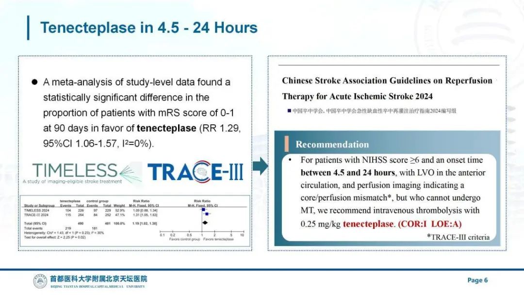 TRACE-Ⅲ试验是由首都医科大学附属北京天坛医院王拥军教授团队发起的一项多中心、前瞻性、开放标签、终点盲法、随机对照III期临床试验。主要纳入发病4.5~24小时内(包括醒后和无目击者卒中)、MRA/CTA提示大动脉(ICA、M1、M2)闭塞且CT、MRI灌注影像提示有可挽救脑组织,但无法进行血管内治疗的急性缺血性卒中患者;关键影像学纳入标准为:(1)梗死核心(ischemic core volume)<70 mL,(2)错配比(mismatch ratio)≥1.8,(3)错配体积(mismatch volume)≥15 mL。TRACE-Ⅲ试验表明在发病4.5~24小时内,前循环大动脉闭塞、有影像半暗带但无法进行血管内治疗的卒中患者中,使用替奈普酶静脉溶栓可降低残疾率[7]。一项关于TIMELESS及TRACE-Ⅲ研究的荟萃分析显示,与对照组相比,替奈普酶显著提高了90天时改良Rankin量表(mRS)评分0-1分的患者比例(RR 1.29, 95%CI 1.06-1.57, I⊃2;=0%)。