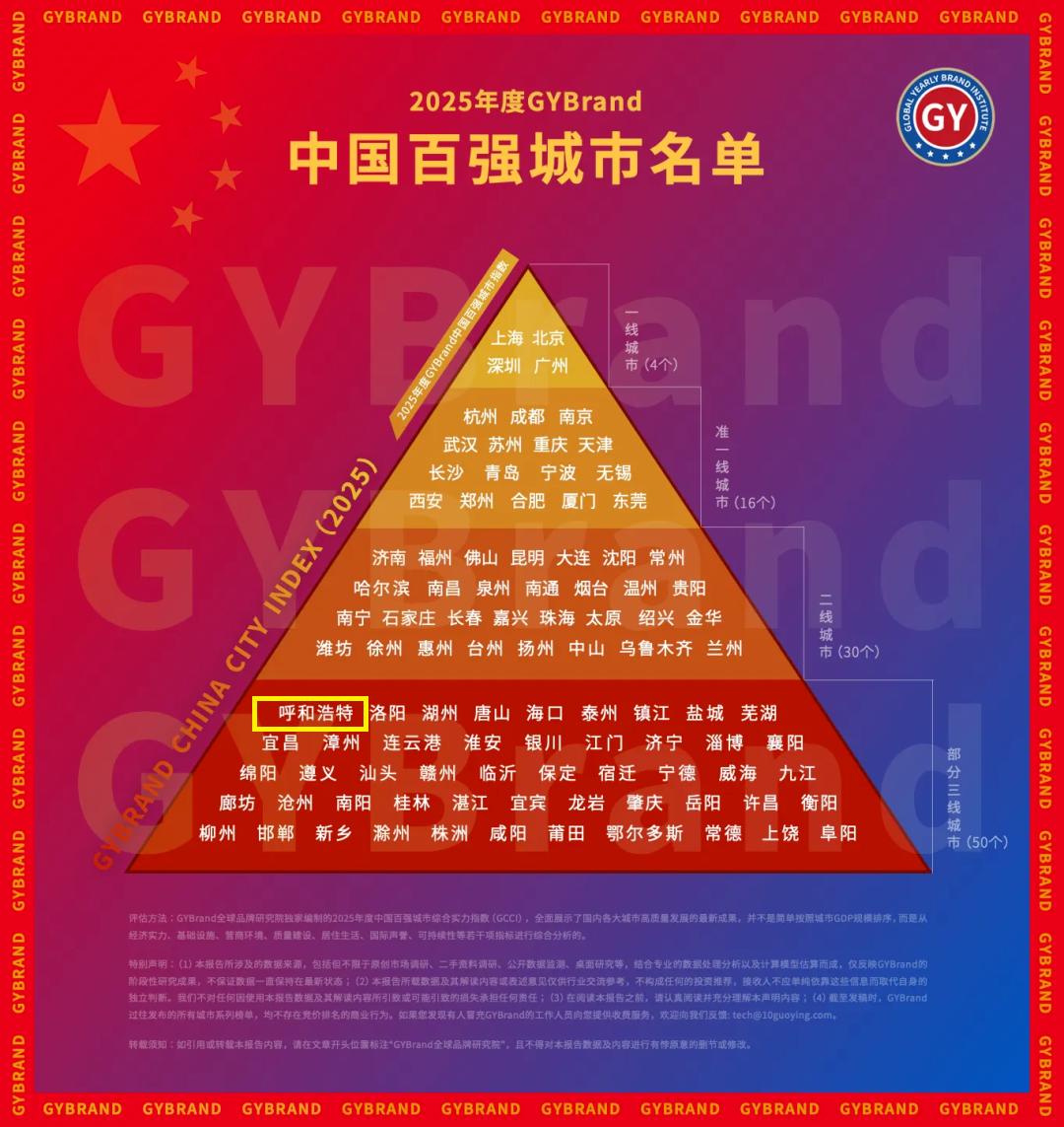 日前,GYBrand全球品牌研究院编制的《2025年度中国百强城市指数报告》正式发布。呼和浩特在“2025年度中国百强城市排行榜”上位列三线城市首位。