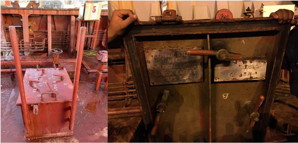 “V”轮取样舱舱盖与下壁墩舱舱盖尽管英文标识不同,但外观并无太大区别。“V”轮下壁墩舱与取样舱口在入口处亦无明显区别,均是从直梯到第一平台。