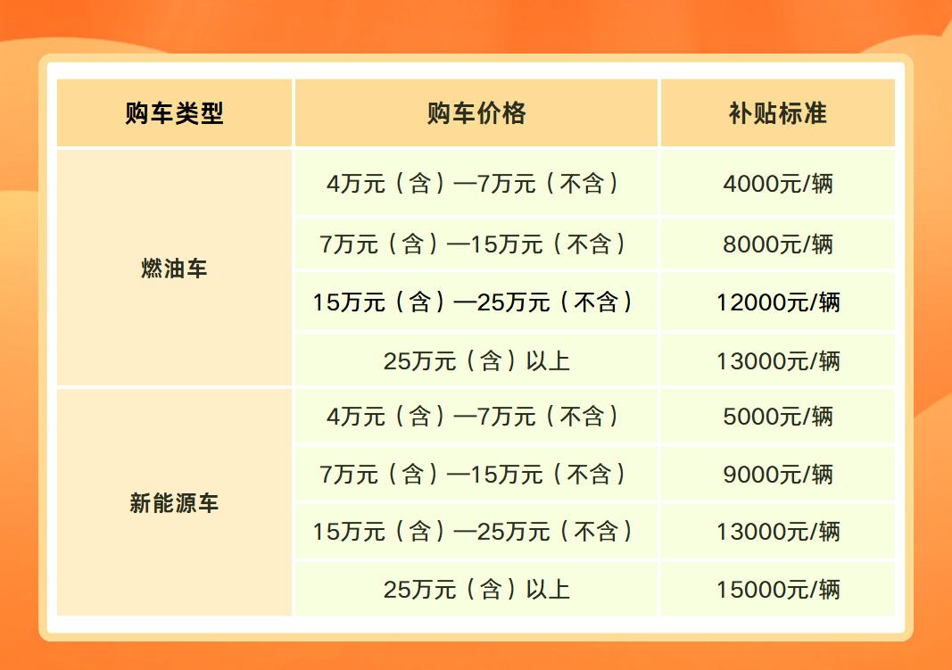 ✅25万元(含)以上的,购买燃油车每辆补贴13000元、新能源车每辆补贴15000元。