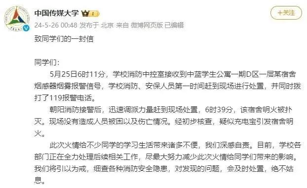 2024年5月25日,北京一高校学生宿舍起火经初步核实燃烧物为室内床铺无人员伤亡,火灾原因正在调查中,高校凌晨发文称疑似充电宝引发宿舍明火。