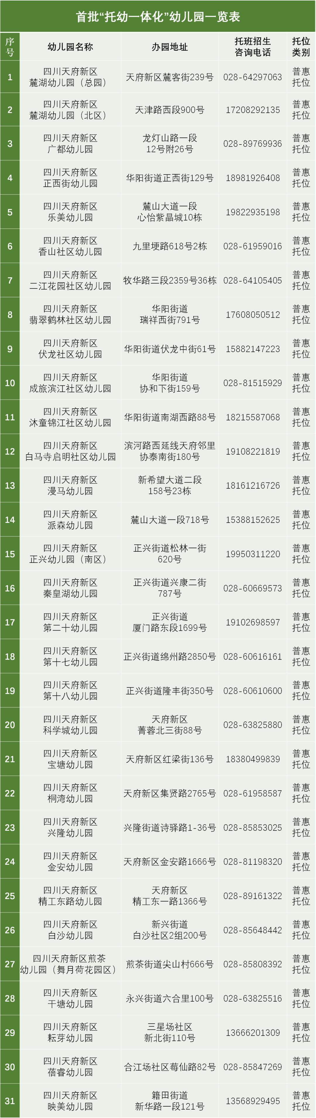 2.四川天府新区麓湖幼儿园、四川天府新区麓湖幼儿园(北区)、四川天府新区科学城幼儿园、四川天府新区宝塘幼儿园、四川天府新区第十八幼儿园托班实行专项招生政策,托班集中招生对象、录取办法等详见其招生简章。
