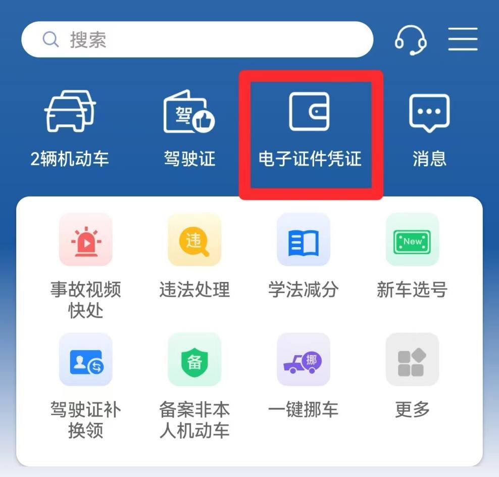 1、登录“交管12123”APP,点击首页“电子证件凭证”。