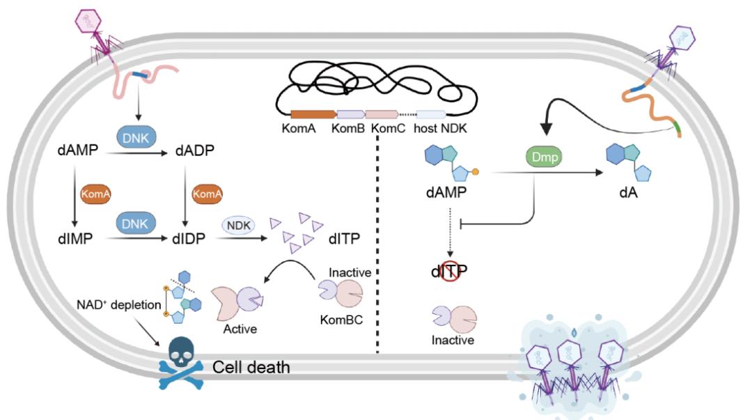 研究团队通过基因分析,锁定了一个三基因操纵子,将其命名为“孔明系统”。该系统编码腺苷脱氨酶(KomA)、HAM1样非典型嘌呤NTP焦磷酸酶(KomB)和含SIR2样结构域的蛋白(KomC)。