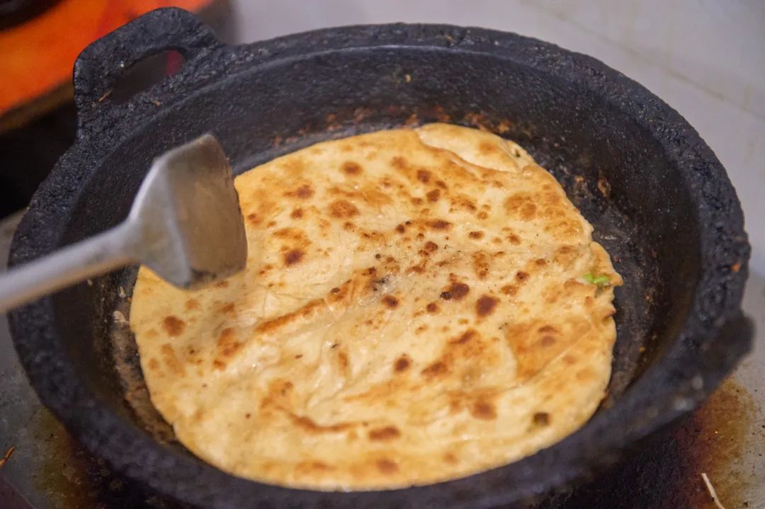 关于烙油馍,修武人讲究“三翻九转”烙制技艺。用小麦面粉擀成薄饼,在铁鏊子上烙至两面微焦,边缘酥脆内里柔韧,当饼面鼓起焦黄斑点时,一张合格的烙油馍就可以出锅了。