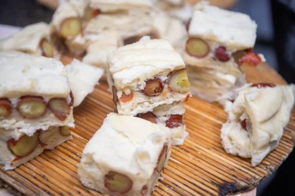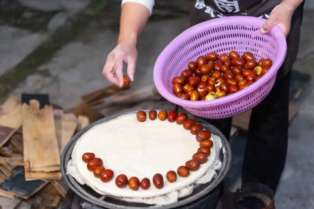 而修武的枣馍常掺入柿子醋提香,刚出锅时氤氲的热气裹着枣香与面香,掰开瞬间能看见半透明的琥珀色枣肉嵌在蜂窝状的面瓤里。