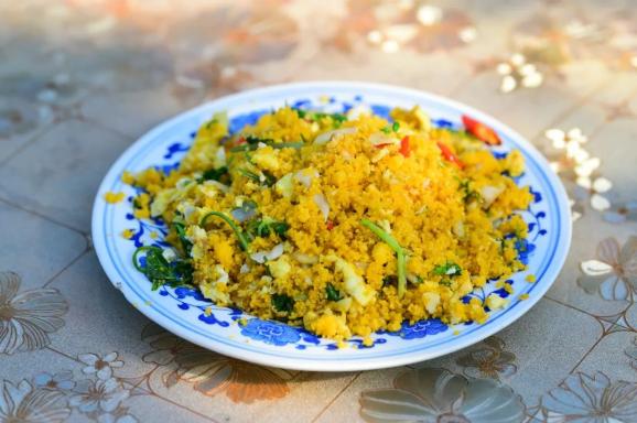 这道菜的做法很讲究,选用修武本地的黄玉米磨成的粗糁,先炒至焦香,再淋入土鸡蛋液,金黄的玉米粒裹着蛋花,口感脆中带糯。