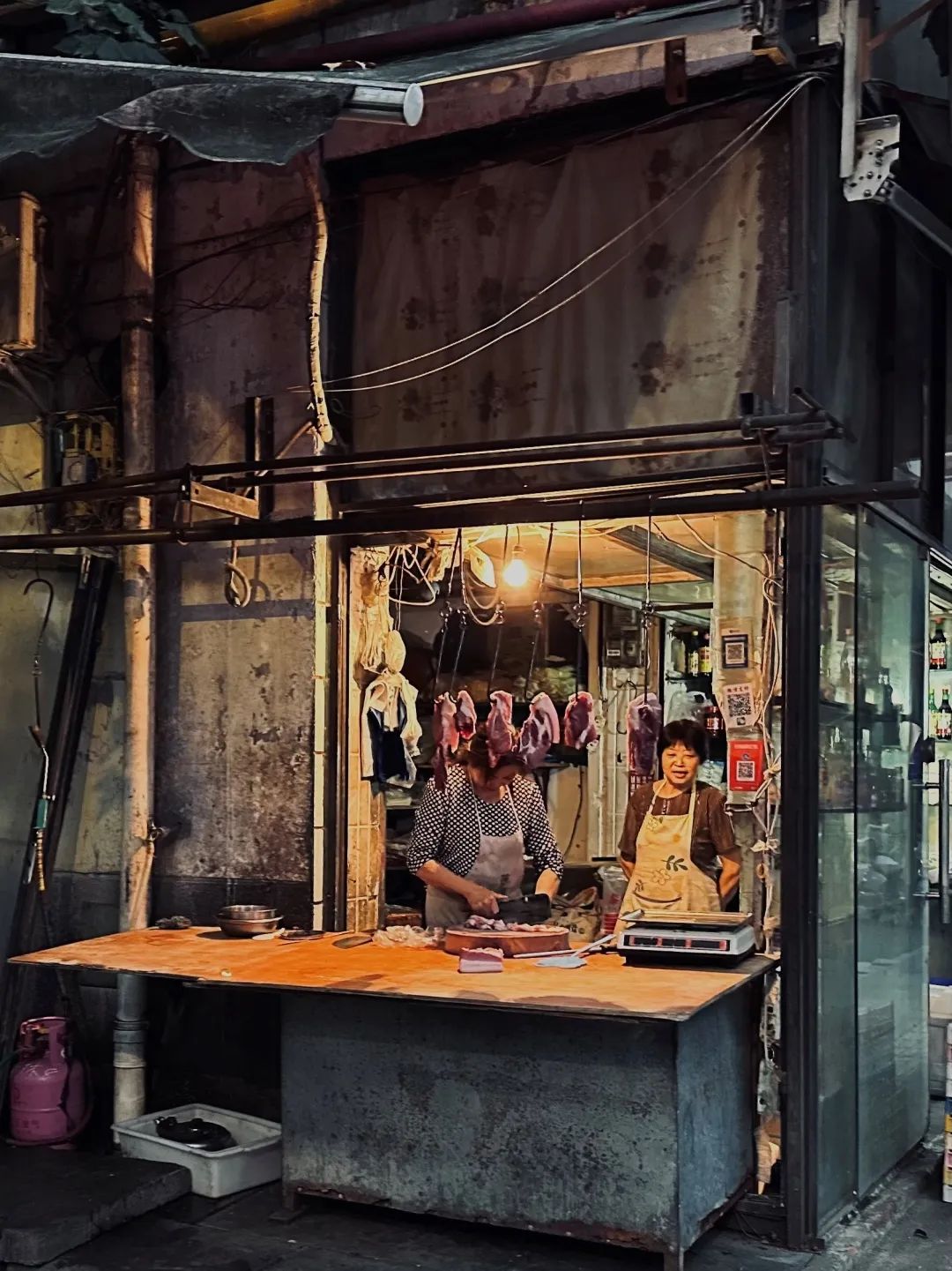 暖黄的光晕,如岁月的轻抚,倾洒在老旧的肉铺。摊主手中的刀起起落落,似在与生活对话。(龙源电力杨宇辰 摄)