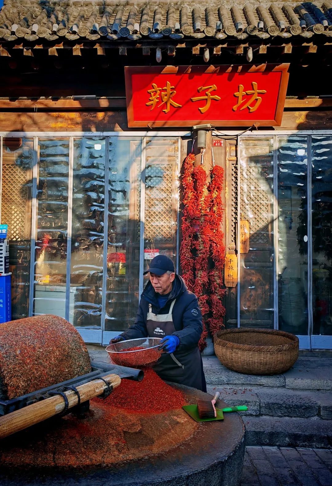 随着老人的动作,古老的石碾与辣椒碰撞,发出 “吱呀吱呀” 的声响,悠悠地回荡在街巷间,唤醒了古城新的一天。(包神铁路席保军 摄)