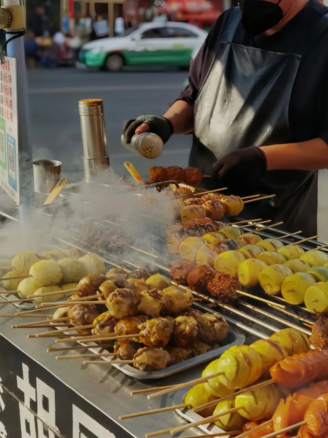 在街头小吃摊的烟火里,每一串都是生活的注脚,热气升腾间,藏着平凡日子里的热闹与满足。(吉林公司张元梓伊 摄)