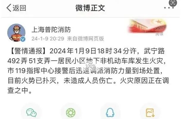 2024年1月9日18时33分,上海市普陀区武宁路492弄51支弄3号(武宁苑)地下一层非机动车库发生火灾,造成1人受伤。经调查,火灾原因为电动自行车在地下车库集中停放充电时电气线路短路引发火灾,当事人在扑救初起火灾时被烧伤。