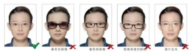 不得佩戴美瞳,不得戴有色眼镜(疾病原因除外),不宜戴粗框眼镜,眼镜框不得遮挡眼睛,镜片无反光;