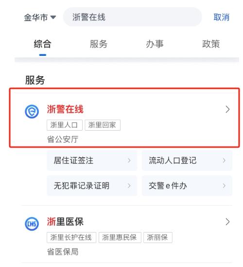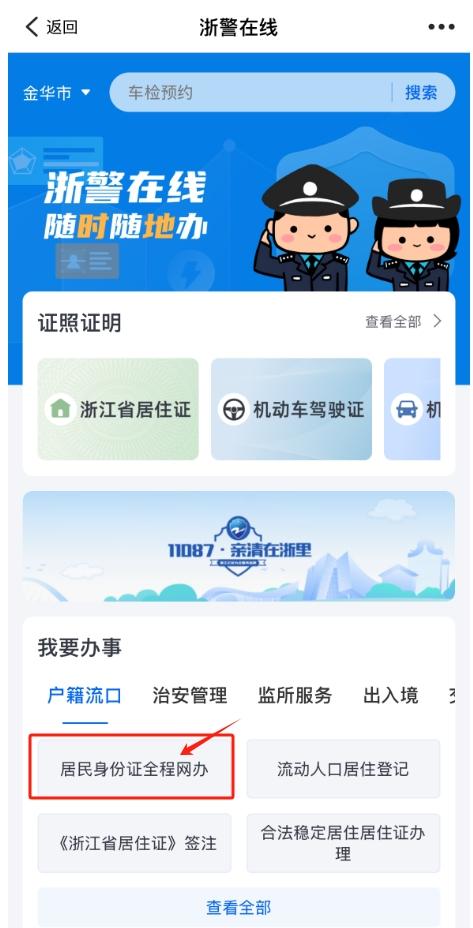 2.以“浙里办”为例在主程序界面搜索并进入“浙警在线-我要办事-居民身份证全程网办”,或者直接搜索“居民身份证换补领(领证未满五年)”事项
