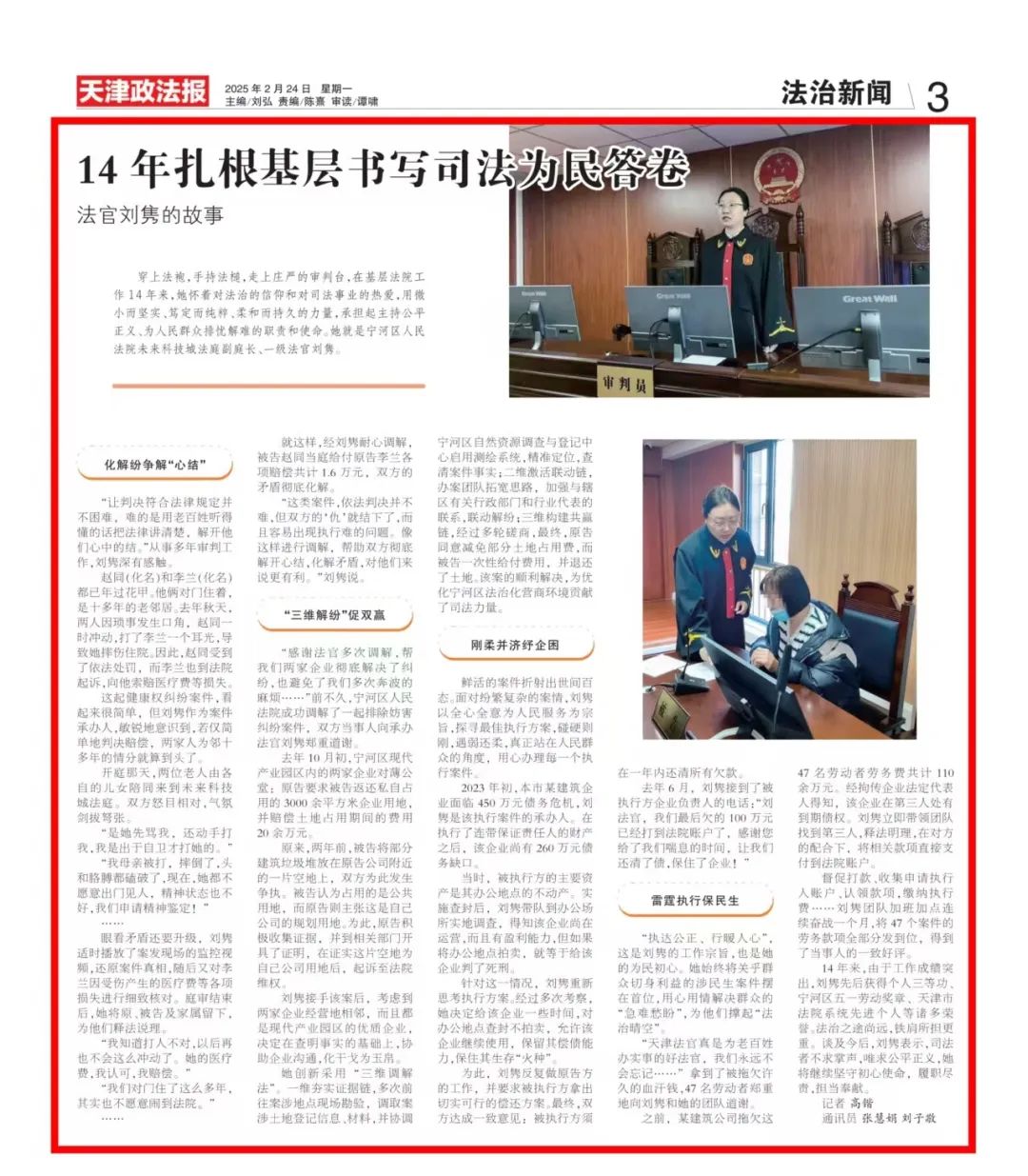14年来,由于工作成绩突出,刘隽先后获得个人三等功、宁河区五一劳动奖章、天津市法院系统先进个人等诸多荣誉。法治之途尚远,铁肩所担更重。谈及今后,刘隽表示,司法者不求掌声,唯求公平正义,她将继续坚守初心使命,履职尽责,担当奉献。