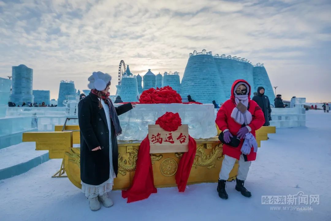 松花江头冰景区寄托了深深祝福,前程似锦、双福临门、年年有鱼、蛇年大吉、福娃等冰景专为春节而设计,为游客和网友“圆梦”推出的“冰马俑”、浪漫的冰封玫瑰墙、承载着心愿的许愿冰墙以及融入了由艺术家韩美林设计的十二生肖景观的“雪花冰迷宫”,均体现了中国传统文化与冰雪艺术的融合之美。