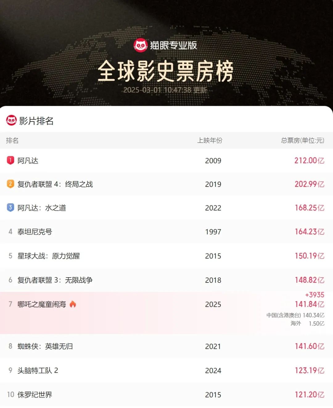 2019年的暑期,影视圈冲出了一匹大黑马:动画电影《哪吒之魔童降世》上映首日,便票房破亿;2025年的春节,《哪吒之魔童闹海》更是以超过141亿元票房荣登全球影史票房榜第7位(截至3月1日)。目前,《哪吒2》的票房持续高歌猛进。