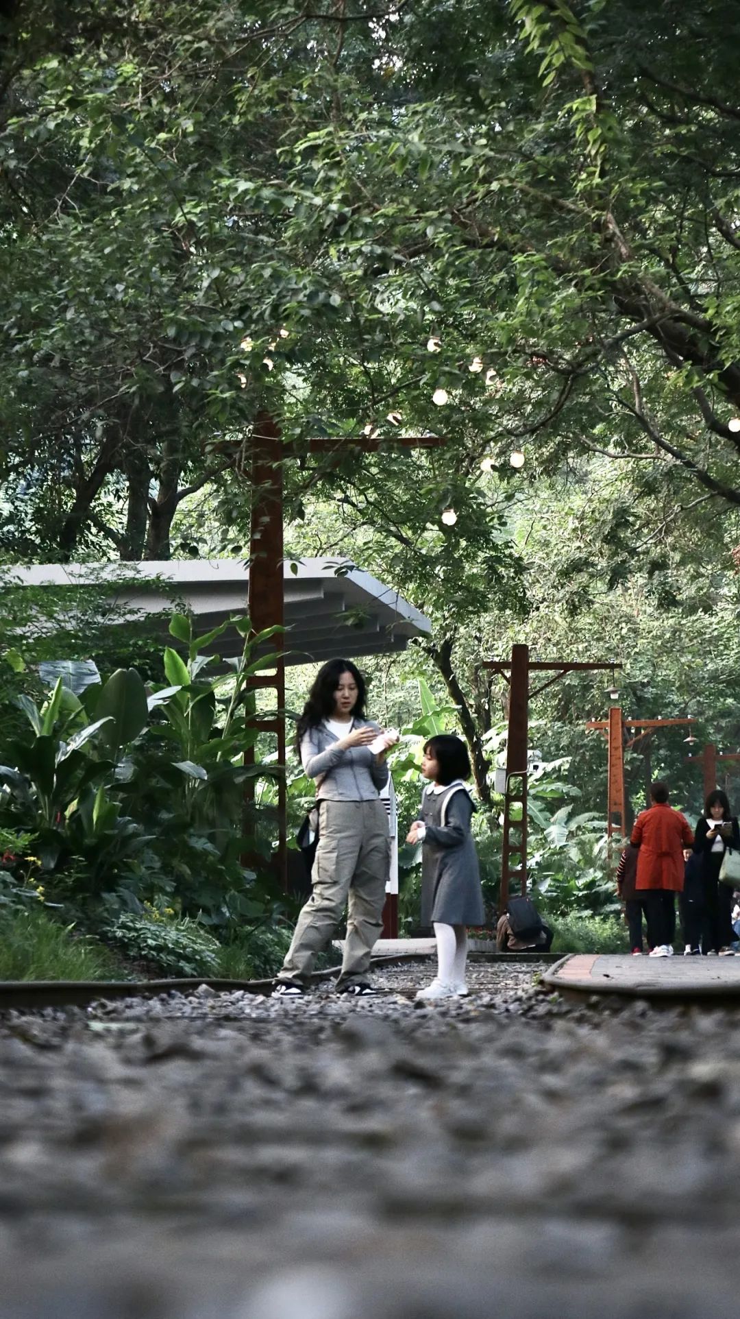 铁轨漫步:铁轨与枕木交错,低角度拍摄延伸感,搭配绿植背景,森系感拉满