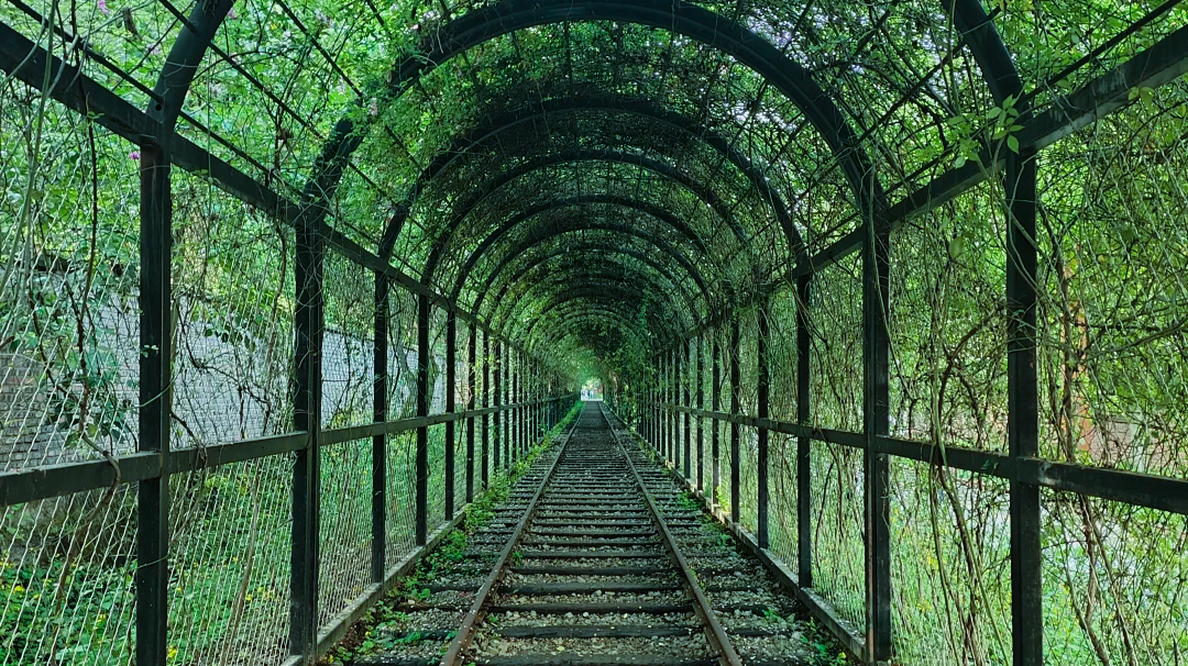 这条铁路原是上世纪60年代的“特钢铁路”,起于特钢厂区第12厂,止于梨树湾专用车站。全长约9.8公里,承载着老重庆的工业辉煌。随着时代变迁,铁轨荒废,却成了川外学子的青春见证。近年来经过改造后,它化身“老铁路山城步道”,铁轨与步道交织,历史与自然共鸣。
