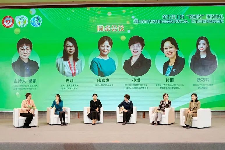 圆桌讨论环节,孙斌、陆嘉惠、付丽、姜萌、阮巧玲围绕“医树奖对女医师的激励”“科研与临床的平衡之道”“对年轻女医师培养的职业建议”等议题展开深入交流,结合个人经历动情地回顾往昔,展望未来。上海报业集团海上名医创始人、上海市女医师协会副秘书长崔颖主持。