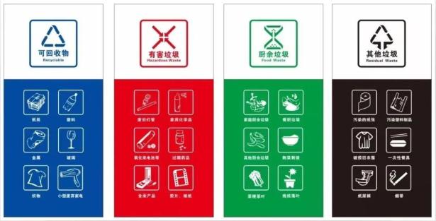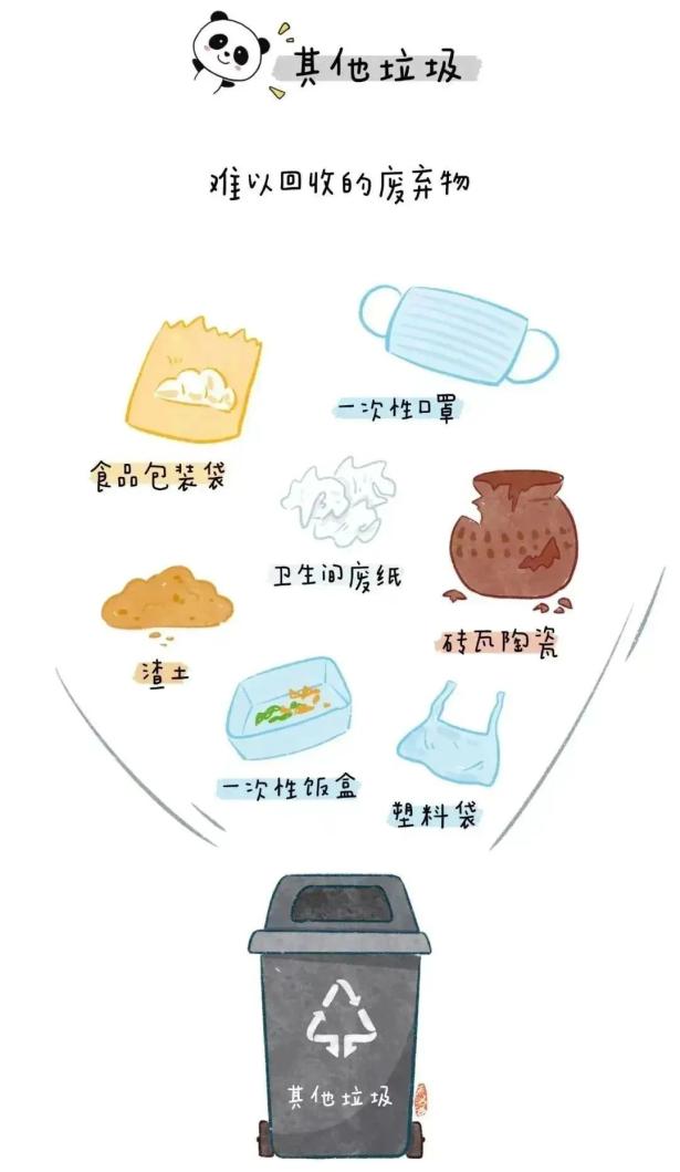 ④ 其他垃圾:除去可回收垃圾、有害垃圾、厨余垃圾之外的所有垃圾的总称。