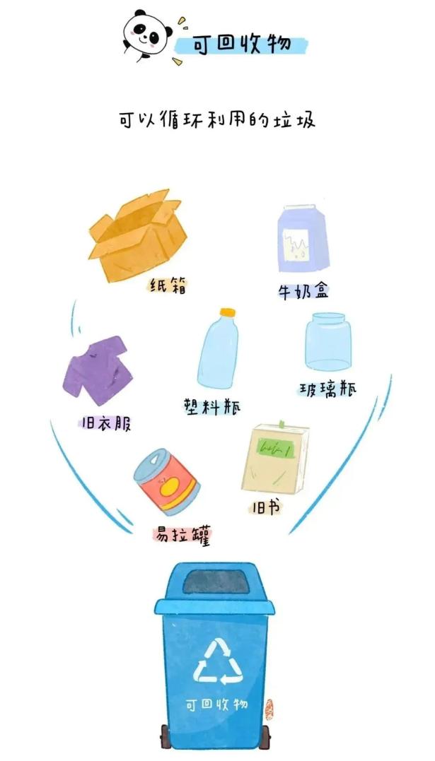 主要包括:纸类(报纸、传单、杂志、旧书、纸板箱及其它未受污染的纸制品等)、金属(铁、铜、铝等制品)、玻璃(玻璃瓶罐、平板玻璃及其他玻璃制品)、除塑料袋外的塑料制品(泡沫塑料、塑料瓶、硬塑料等)、橡胶及橡胶制品、牛奶盒等利乐包装、饮料瓶(可乐罐、塑料饮料瓶、啤酒瓶等)等。