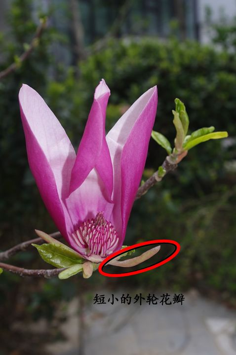 这种外轮花瓣超短的情况,在紫玉兰中也能见到,花瓣外面是纯粹的紫红色,内面泛白色。它们的植株比较矮小,触手可及。不过紫玉兰花期更晚,绿叶已经伸展出来,花叶同时开放。