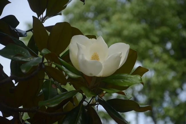 玉兰属植物大多春天开花,不过夏天也有少数的“玉兰花”——木兰属的广玉兰,也叫荷花玉兰在繁茂的枝叶间大朵盛开。虽然我国南方城市广泛栽培,却是个货真价实的外来物种。广玉兰原产北美东南部。常绿乔木,树形优美,花大洁白,状如荷花。具有硬革质的叶,叶背面还呈现铁锈般的黄色。与春季绽放在光秃枝头的玉兰属植物截然不同。