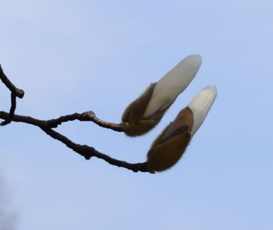 常见玉兰属植物大多是春季先开花后长叶的高大乔木。花期比玉兰稍早几天的望春玉兰,在城市中也比较常见。望春玉兰的花型更为疏朗,花瓣常比玉兰更苗条,像把小勺子。最主要的区别是望春玉兰的最外一轮花瓣短小很多,容易被忽略,而且常早早脱落。看起来只有6片花瓣。小枝条灰绿色。